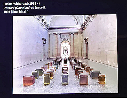 Angela then showed many other more recent examples, including castings of many chairs as a memorial to the Holocaust, and Ai Weiwei's use of many traditional Chinese stools assembled into patterns to investigate the relationship of the individual and the state in China. Columbian artist, Doris Salcedo, stacked 1,550 chairs on the Palace of Justice in Bogota to remember 1550 victims of a siege of the building, with the chairs being lowered down the face of the building over 52 hours of the siege, at the time of the deaths of the individuals.