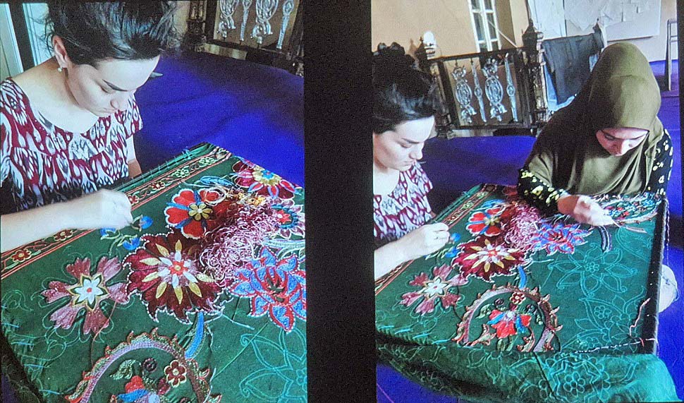 In relatively little time, silk began to stratify society, as it has continued to do. The softest silks and muslins became highly prized by the Romans, who paraded in the ‘glass togas’ that we witness in treasured sculptures today. But the Silk Road became the conduit ( and in both directions) for many other things, familiar today, but originating in Central Asia and China -paper, rhubarb, apples, hollyhocks, tulips and many garden plants. More darkly there was gunpowder and bubonic plague, carried by marmots, who were resistant to plague, though fleas from their carcasses carried it to the West in bales of cloth. Few, other than missionaries, travelled the length of the Silk Road. Most of the traders were Zoroastrian Sogdians , whose capital was Samarkand, the centre for paper making for the Islamic world. Today it’s in Uzbekistan and still a centre for sericulture, its roads lined with mulberry trees, and increasingly on the mainstream tourist trail. Chris himself contributed to the revival of traditional carpet designs, now prized by tourists, working for a Swedish NGO and establishing a silk carpet workshop in Khiva, Uzbekistan. His in depth knowledge of textile production techniques, the turbulent history of the area and personal anecdotes kept his audience enthralled. The brilliant colours of the textiles, some of which he had brought along, were in stark contrast to the vast, bleak but haunting landscapes in his photographs.